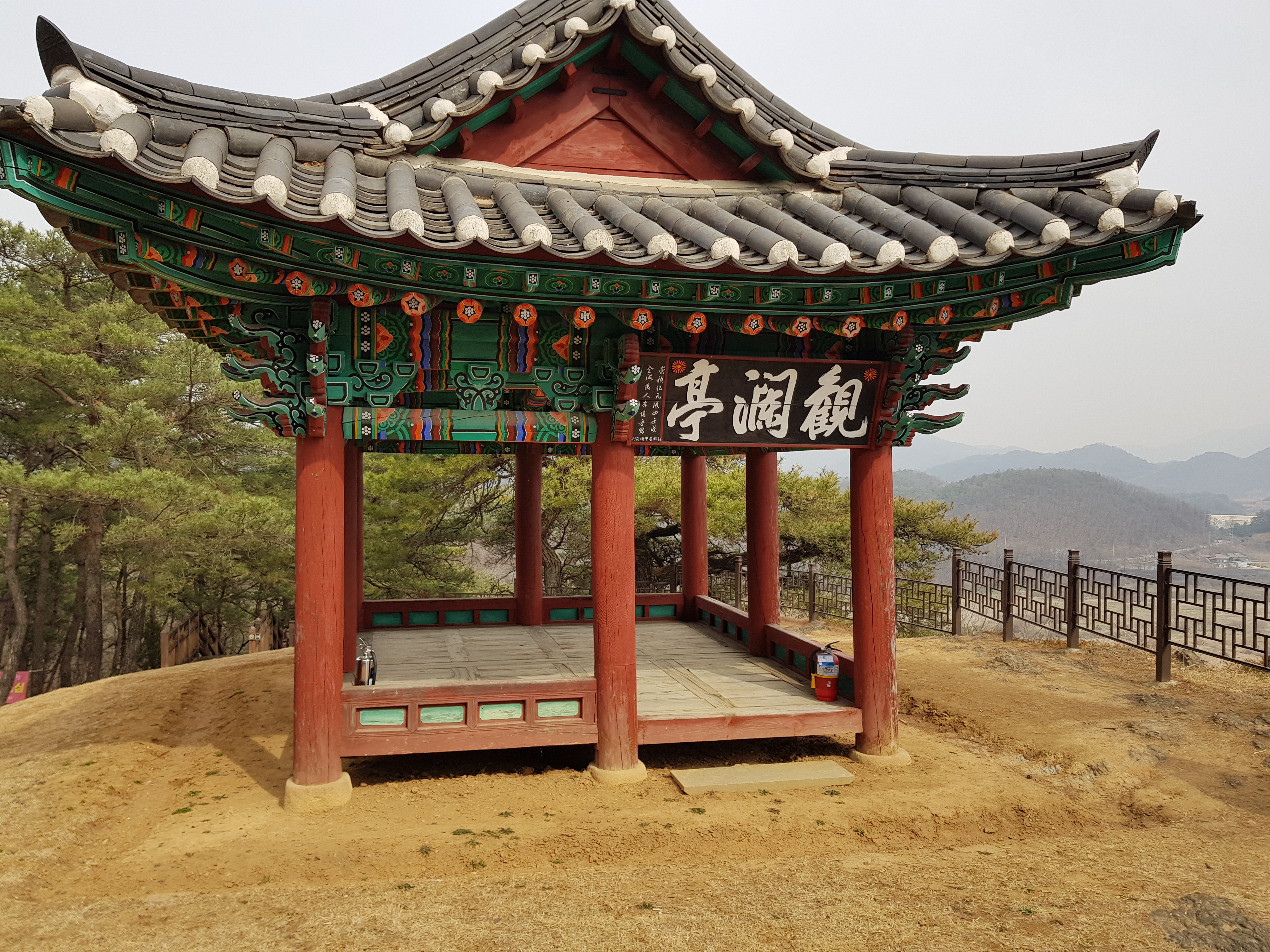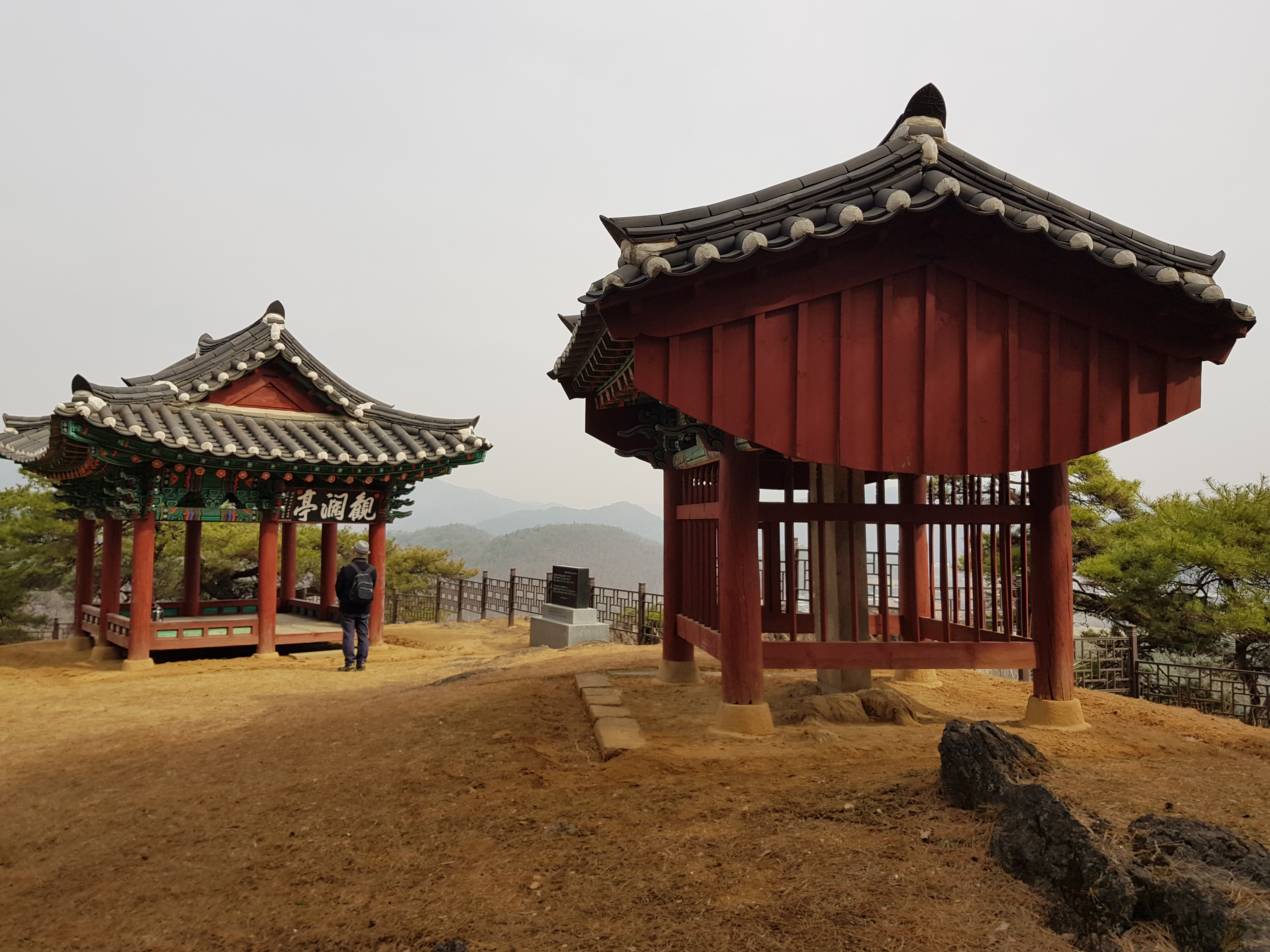 승용차를 타고 중앙고속도를 달리다가 신림 요금소(Tol Gate)에서 빠져 나가 네비게이션의 안내를 따라 20분쯤 달리니, 관란정 안내 표지판이 나왔다. 차에서 내려 비탈진 산길을 걸어 올라가니, 그리 높지 않은 산등성이의 자연암반 위에 동향으로 지은 관란정이 서 있다. 팔작지붕에 기와를 얹고, 모로단청(부재의 두 끝 부분에만 하는 단청)을 하였다. 바로 앞에 있는 비각 안에는 관란 선생을 기리는 유허비(遺墟碑)가 있다. 눈을 들어 앞을 보니, 나지막한 산들이 멀리까지 펼쳐 있고, 그 뒤를 큰 산들이 에워싸고 있다. 산 아래에는 주천강과 평창강이 합수한 서강이 산들을 에둘러 흐르고 있다.