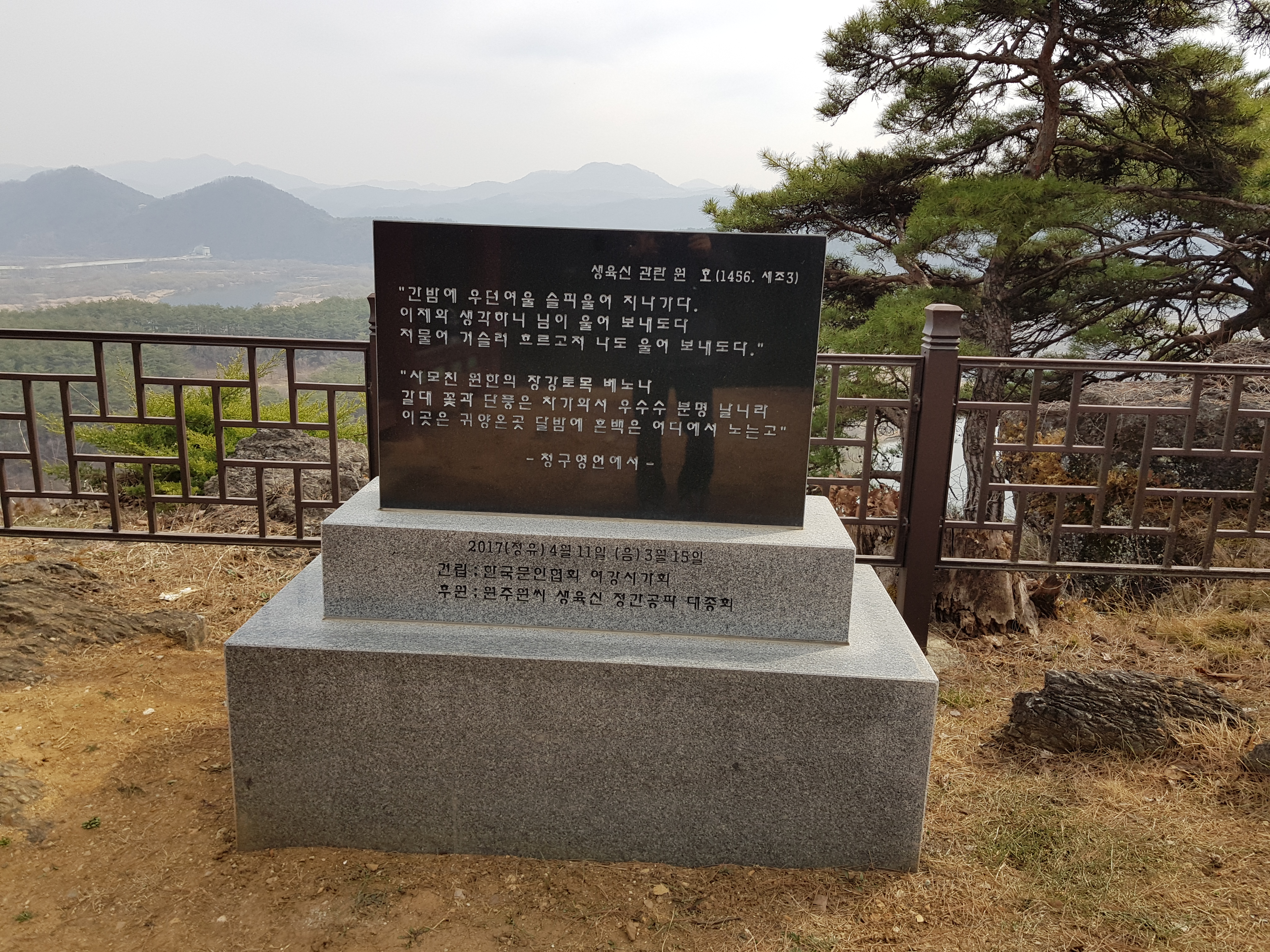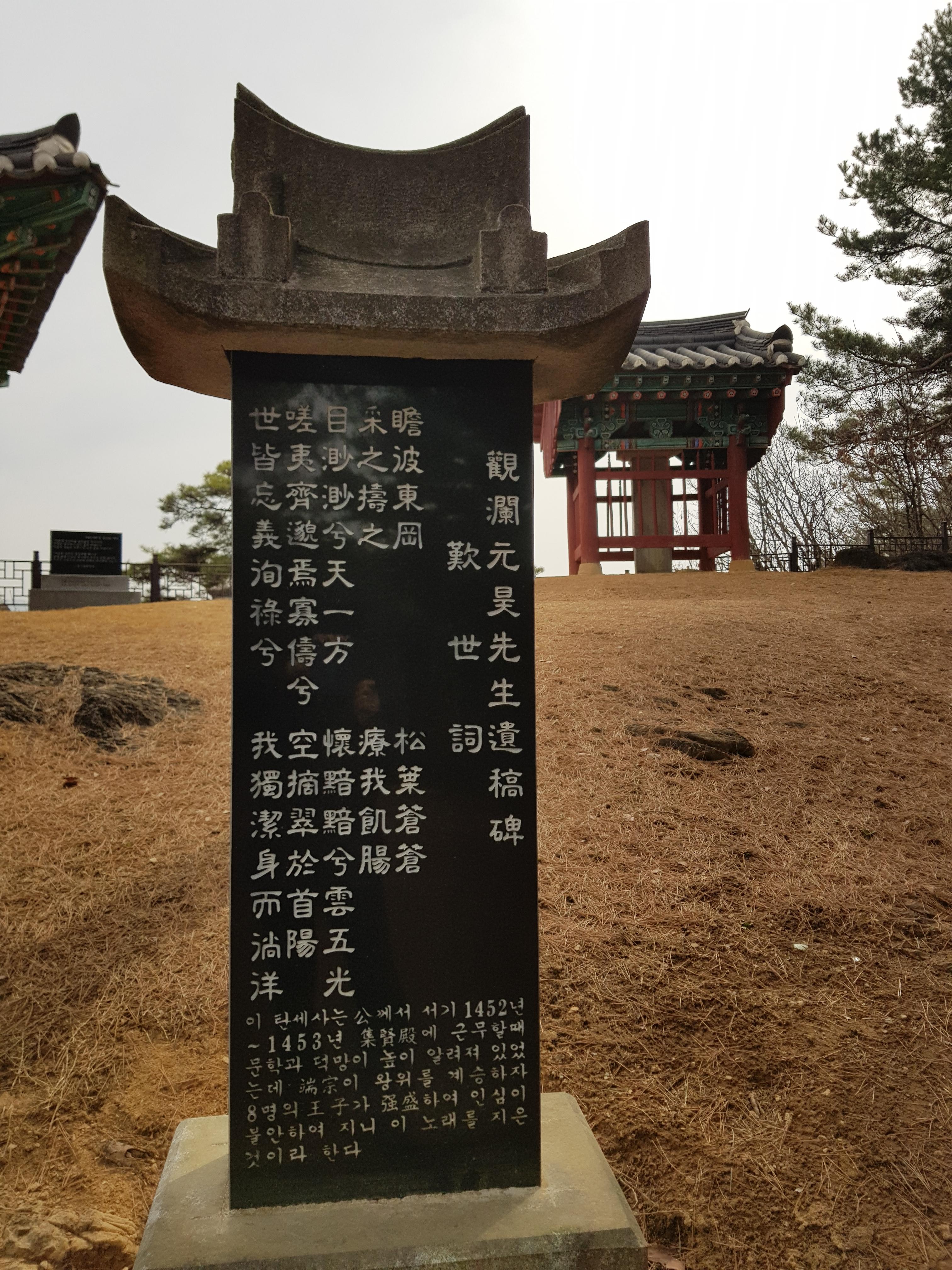 관란정 왼편에는 한국문인협회 여강시가회에서 세운(2017년 건립) 시비가 있다. 거기에 《청구영언》에 실려 있는, “간밤에 우던 여울 슬피 울어 지나가다./ 이제와 생각하니 님이 울어 보내도다./ 저 물아 거슬러 흐르고저 나도 울어 보내도다.”라는 시조가 씌어 있다. 밤 새워 흐르는 여울물 소리가 슬픈 것은 임이 울어 보내기 때문이다. 여울물이 거꾸로 흐른다면 나의 충심을 실어 보낼 수 있겠다고 하였다. 이 시를 읽으니, 어린 임금을 유배지로 압송하는 임무를 맡았던 의금부도사 왕방연의 시조, “천만리 머나먼 길에 고운 임 여의옵고, 내 마음 둘 데 없어 시냇가에 앉았으니, 저 물도 내안 같도다. 울어 밤길 예놋다(가도다).”가 떠오른다. 두 작품은 단종에 대한 충정을 여울물에 투사하여 절실하게 표현하였다는 점에서 일치한다.