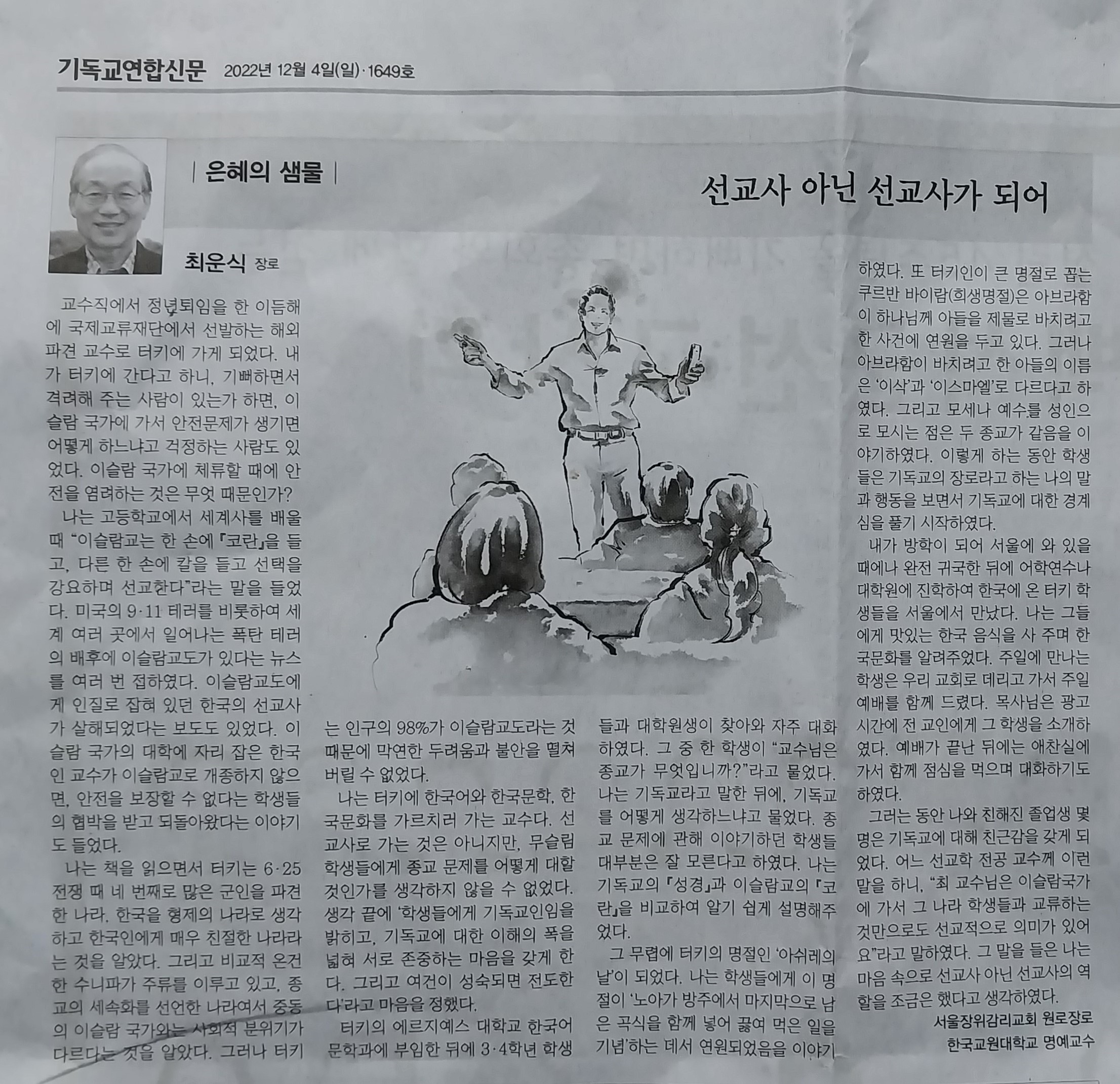 그러는 동안 나와 친해진 졸업생 몇 명은 기독교에 대해 친근감을 갖게 되었다. 어느 선교학 전공 교수께 이런 말을 하니, “최 교수님은 이슬람국가에 가서 그 나라 학생들과 교류하는 것만으로도 선교적으로 의미가 있어요.”라고 말하였다. 그 말을 들은 나는 마음속으로 선교사 아닌 선교사의 역할을 조금은 했다고 생각하였다. <기독교연합신문 1649호, 2022. 12. 4.>