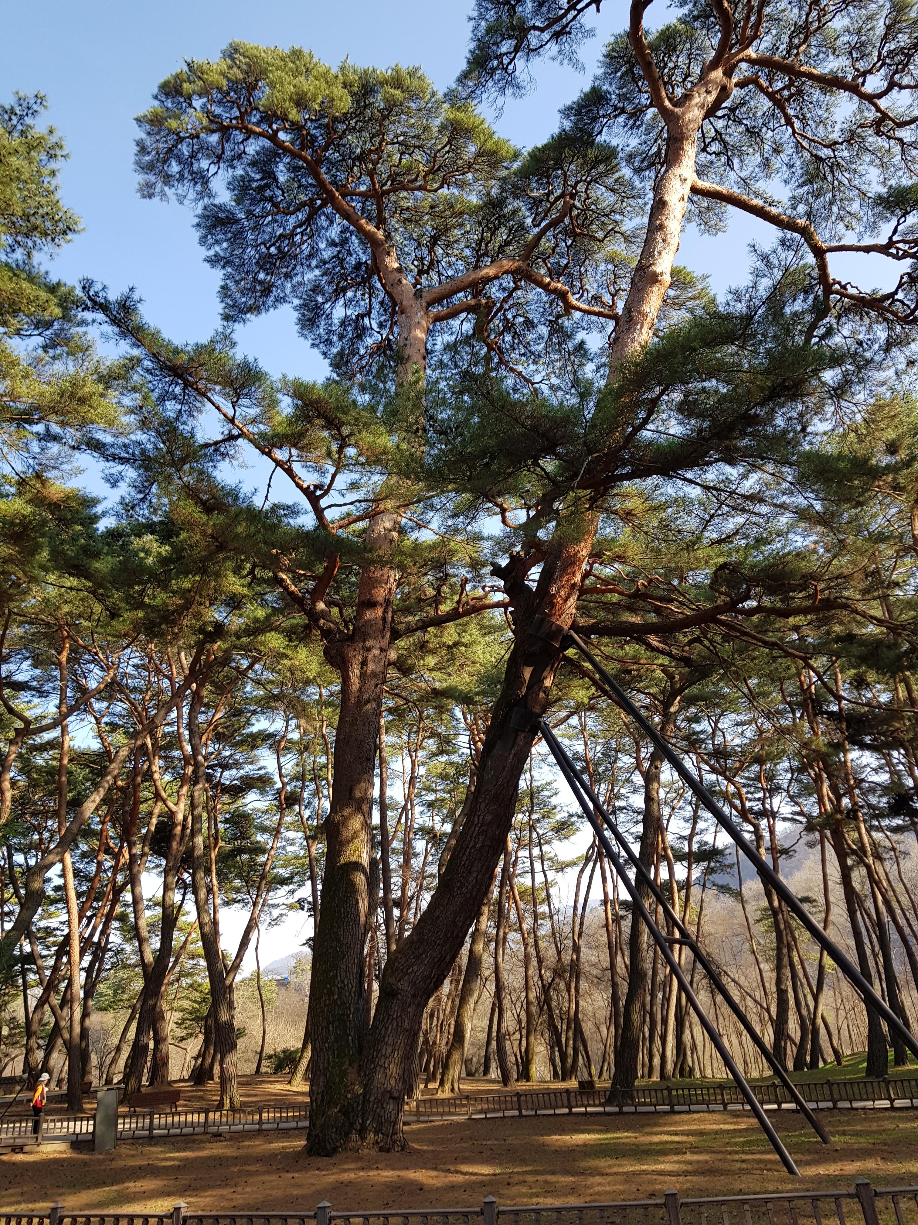 송림에 서니, 낙락장송(落落長松)들이 서 있는 모습이 웅장하며 위엄 있게 보였다. 소나무의 품격 있고 멋진 모습에 나도 모르게 감탄의 말이 튀어나왔다. 많은 소나무 중에서 나의 관심을 끈 것은 송림 중앙의 서편에 있는 ‘관음송(觀音松)’이었다. 안내문에 적힌 것을 보니, 관음송은 높이가 30m이고, 가슴높이 줄기의 둘레가 5m라고 한다. 지상 1.2m 높이에서 갈라진 두 가지의 밑 둘레는 각각 3.3m와 2.95m이다. 나무의 나이는 확실하지 않으나, 단종(1441~1457)이 유배생활을 할 때 이 나무의 갈라진 사이에 앉아서 쉬었다는 이야기가 전해 오고 있어서 약 600년 정도로 추정한다. ‘관음(觀音)’은 불교에서 세상의 소리를 들어 알 수 있는 보살을 가리키는 말이다. 그런데 이 소나무에 관음송이라는 이름을 붙인 것은 무슨 까닭일까? 사람들은 이 소나무가 당시 단종의 비참한 모습을 보았다 하여 볼 관(觀), 들었다 하여 소리 음(音) 자를 써 관음송이라고 하였다 한다. 이 나무는 현재 천연기념물 제349호로 지정되었다.