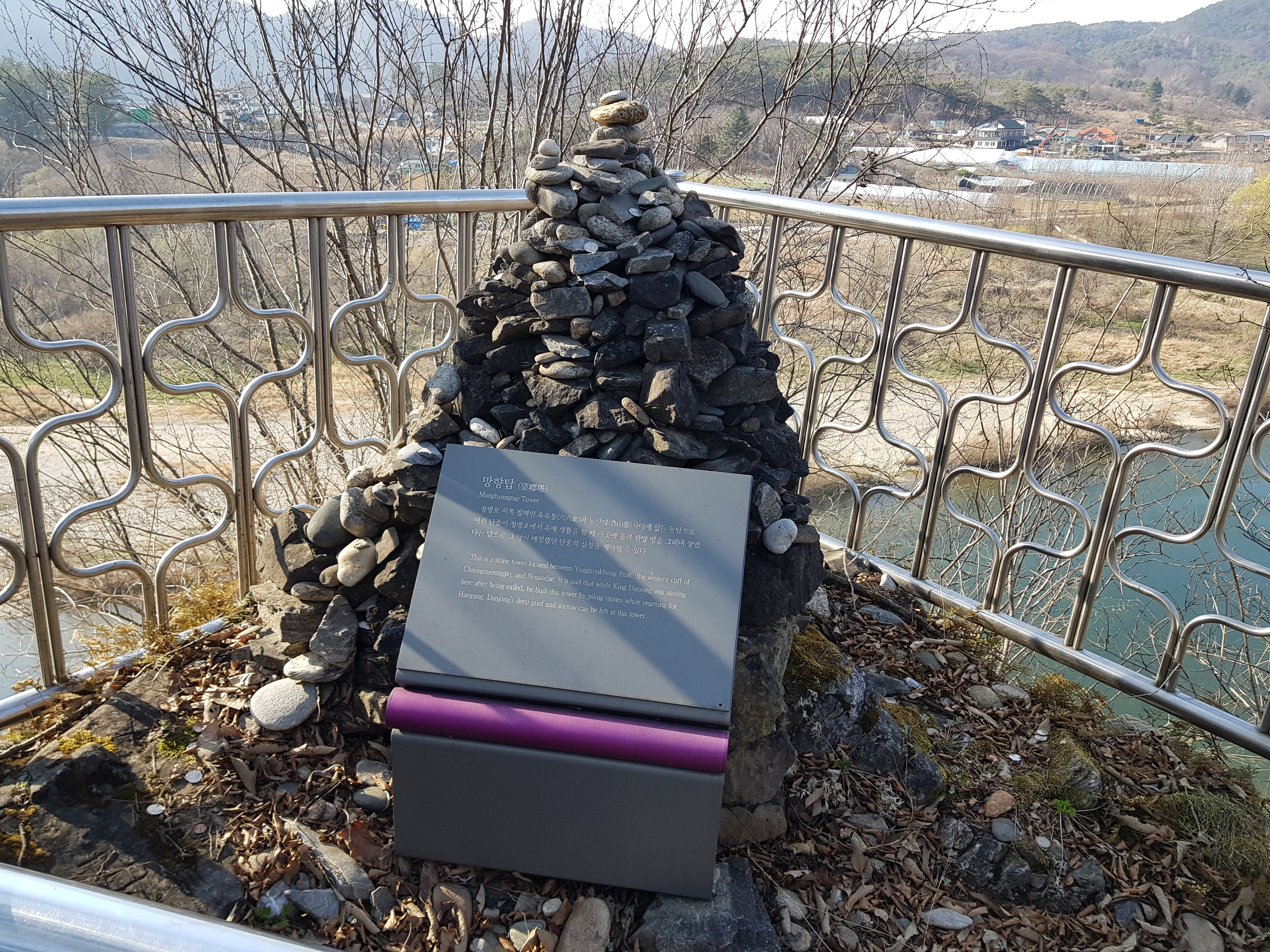 송림 서편의 산을 오르니, 약 80미터 높이의 절벽을 이룬 큰 바위가 있다. 단종은 자주 이곳에 와서 치밀어 오르는 분노와 슬픔을 참을 길 없어 울부짖기도 하고, 절망어린 한숨을 짓기도 하였을 것이다. 사람들은 이곳을 ‘노산대’라고 불렀다. 단종은 원호가 박속에 넣어 보낸 채소를 노산대 밑에서 받았을 것이라 한다. 분노와 슬픔이 가라앉은 뒤에는 정든 고향과 사랑하는 사람들을 생각하고, 정순왕후를 그리며 평안을 비는 간절한 마음으로 돌탑을 쌓았다. 이 탑을 ‘망향탑’이라 한다. 이곳에서 생활하던 단종의 동선은 어소와 관음송, 노산대와 망향탑으로 이어진다.