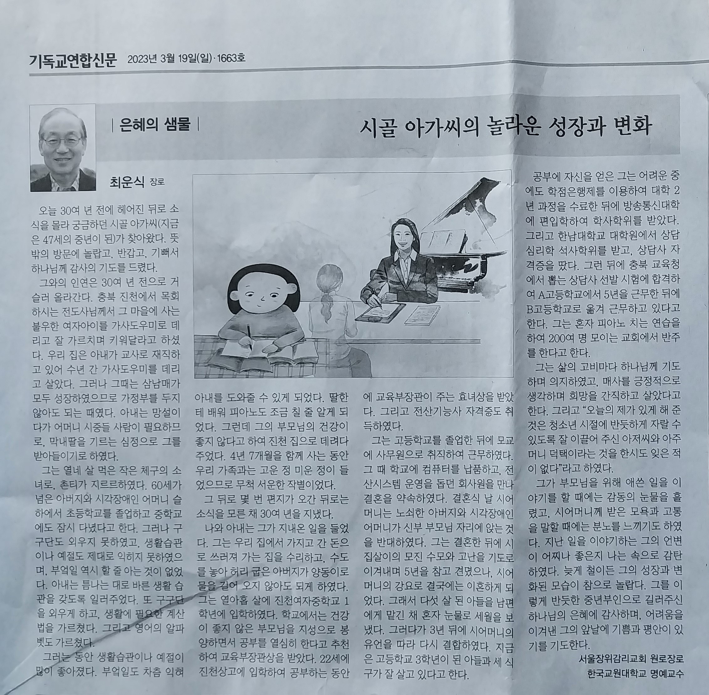 그는 삶의 고비마다 하나님께 기도하며 의지하였고, 매사를 긍정적으로 생각하며 희망을 간직하고 살았다고 한다. 그리고 오늘의 자기가 있게 해 준 것은 청소년 시절에 반듯하게 자랄 수 있도록 잘 이끌어 주신 아저씨와 아주머니 덕택이라는 것을 한시도 잊은 적이 없다고 하였다. 그가 부모님을 위해 애쓴 이야기를 할 때에는 감동의 눈물을 흘렸고, 시어머니께 겪은 일을 말할 때에는 분노를 느끼기도 하였다. 지난 일을 이야기하는 그의 언변이 어찌 좋은지 나는 속으로 감탄을 하였다. 학습부진아였던 그의 성장과 변화된 모습이 놀라웠다. 그를 이렇게 반듯한 중년부인으로 길러주신 하나님의 은혜에 감사하며 어려움을 이겨낸 그의 앞날에 기쁨과 평안이 있기를 기도한다. <기독교연합신문 제1663호, 2023. 3. 19.>