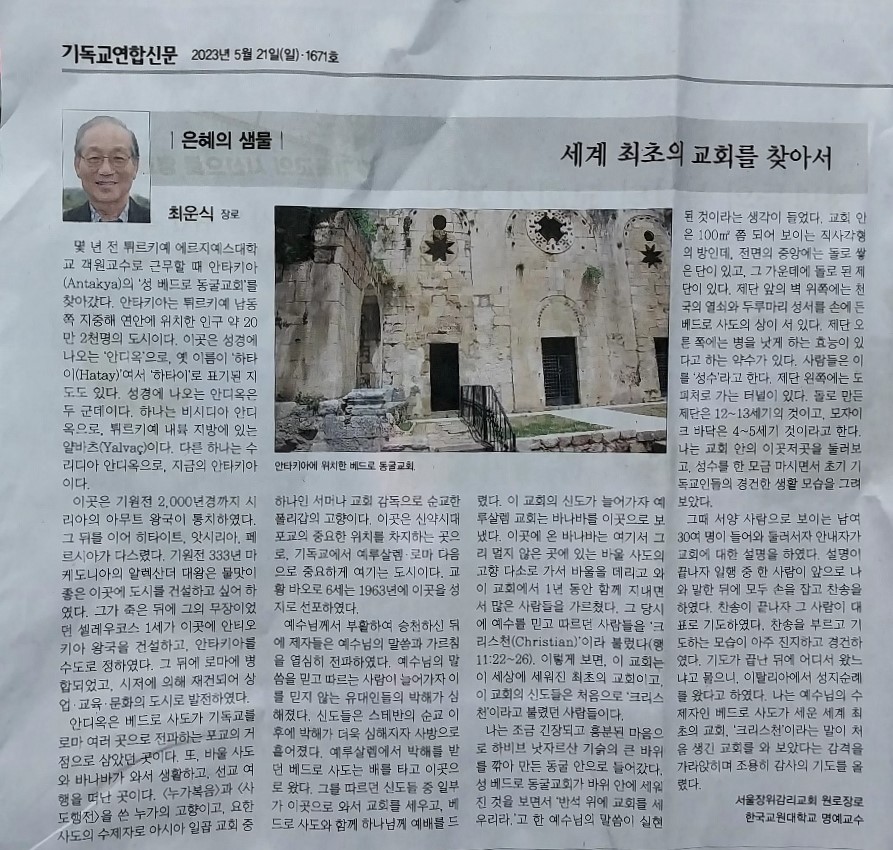 몇 년 전 튀르키예 에르지예스대학교 객원교수로 근무할 때 안타키아(Antakya)의 ‘성 베드로 동굴교회’를 찾아갔다. 안타키아는 튀르키예 남동쪽 지중해 연안에 위치한 인구 약 20만 2천명의 도시이다. 이곳은 성경에 나오는 ‘안디옥’으로, 옛 이름이 하타이(Hatay)여서 하타이로 표기된 지도도 있다. 성경에 나오는 안디옥은 두 군데이다. 하나는 비시디아 안디옥으로, 튀르키예 내륙 지방에 있는 얄바츠(Yalvaç)이다. 다른 하나는 수리디아 안디옥으로, 지금의 안타키아이다.