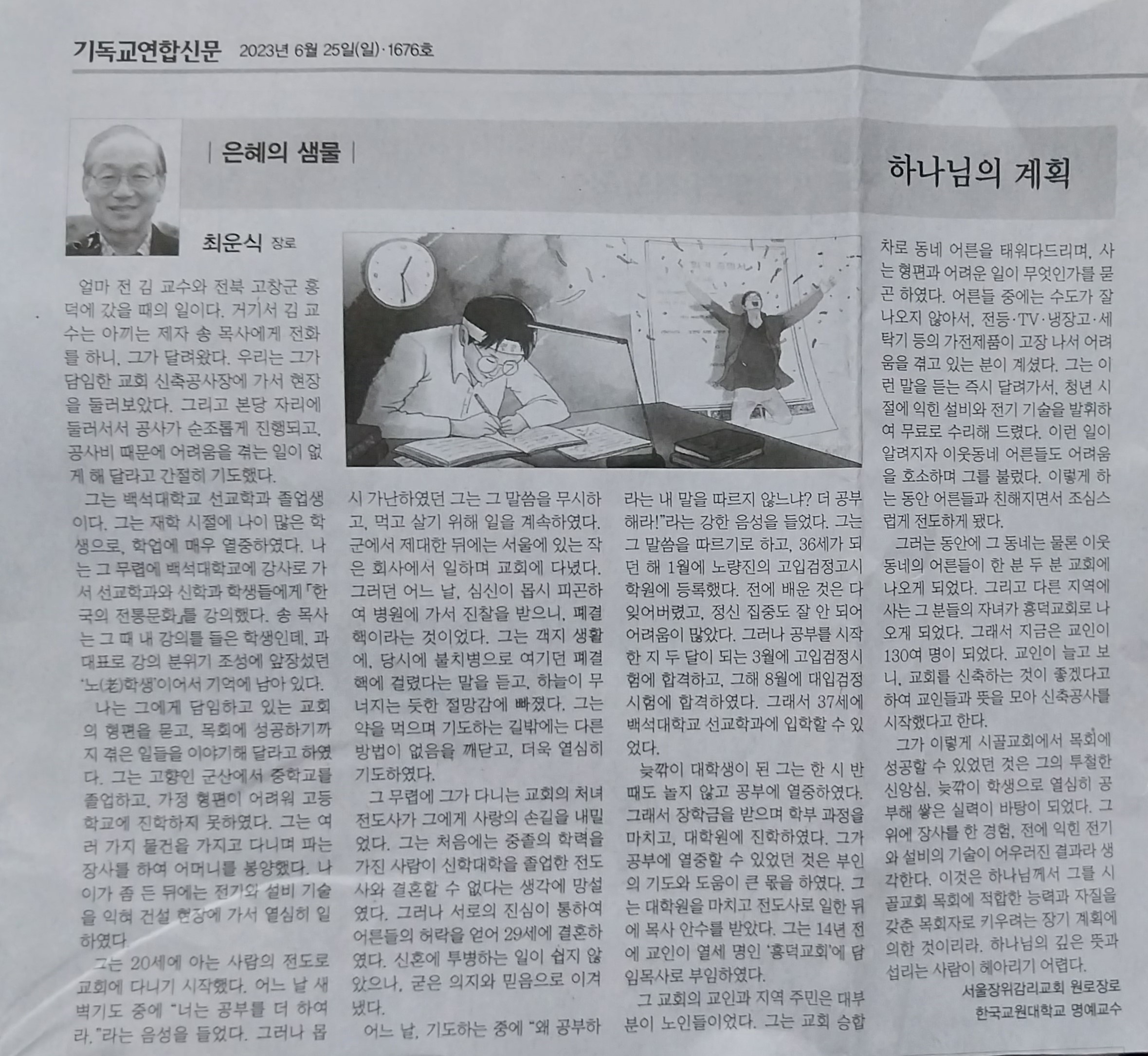 늦깎이 대학생이 된 그는 한 시 반 때도 놀지 않고 공부에 열중하였다. 그래서 장학금을 받으며 학부 과정을 마치고, 대학원에 진학하였다. 그가 공부에 열중할 수 있었던 것은 부인의 기도와 도움이 큰 몫을 하였다. 그는 대학원을 마치고 전도사로 일한 뒤에 목사 안수를 받았다. 그는 14년 전에 교인이 열세 명인 흥덕교회에 담임목사로 부임하였다.