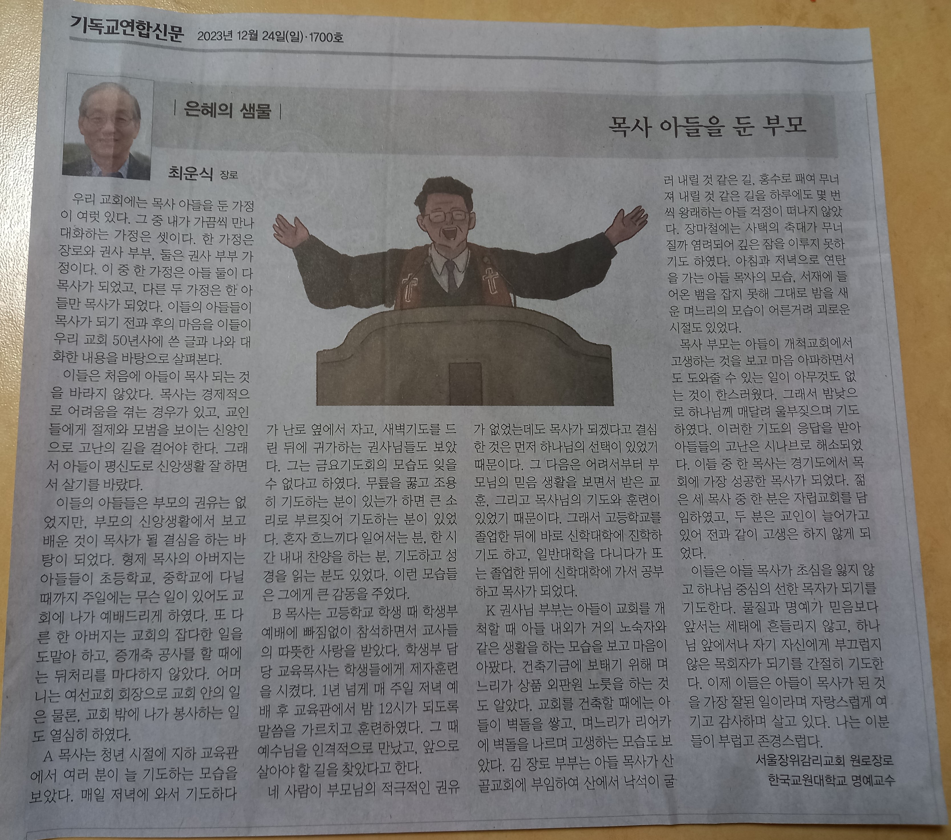 이들은 아들 목사가 초심을 잃지 않고 하나님 중심의 선한 목자가 되기를 기도한다. 물질과 명예가 믿음보다 앞서는 세태에 흔들리지 않고, 하나님 앞에서나 자기 자신에게 부끄럽지 않은 목회자가 되기를 간절히 기도한다. 이제 이들은 아들이 목사가 된 것을 가장 잘된 일이라며 자랑스럽게 여기고 감사하며 살고 있다. 나는 이분들이 부럽고 존경스럽다. <기독교연합신문 제1700, 2023. 12. 24.>